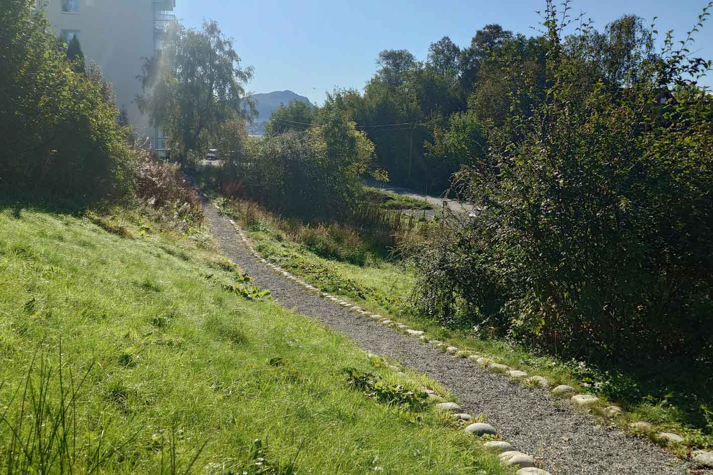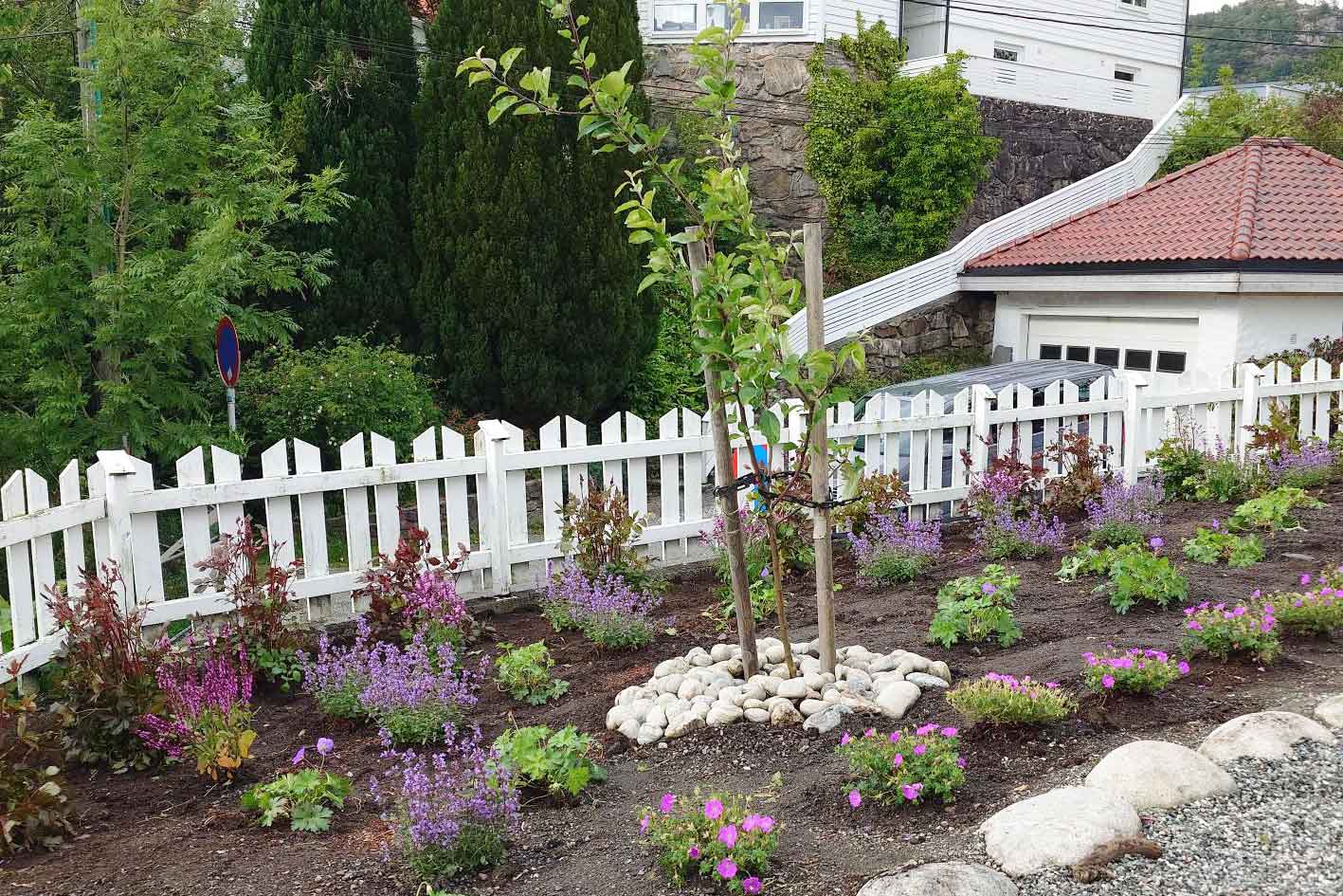 Over the course of several years, the housing association has transformed the outside area making use of the Norwegian communitiy effort called 'dugnad', where people meet for voluntary work, a mix of labour and social event, a great way to get to know your neighbours and take ownership of common areas. This 'dugnad' has paid of: The planting scheme is much more varied, there are now borders with perennials, rowan trees, fruit trees, shrubs, a staircase connecting the upper and the lower level, and a pathway along the entire area. Everyone is pleased with the changes, and I was told that there are noticably more birds and insects. What a gratifying job!!!
